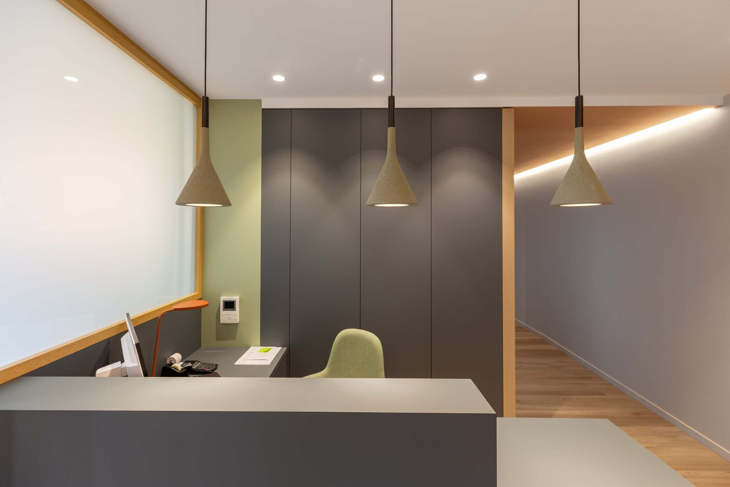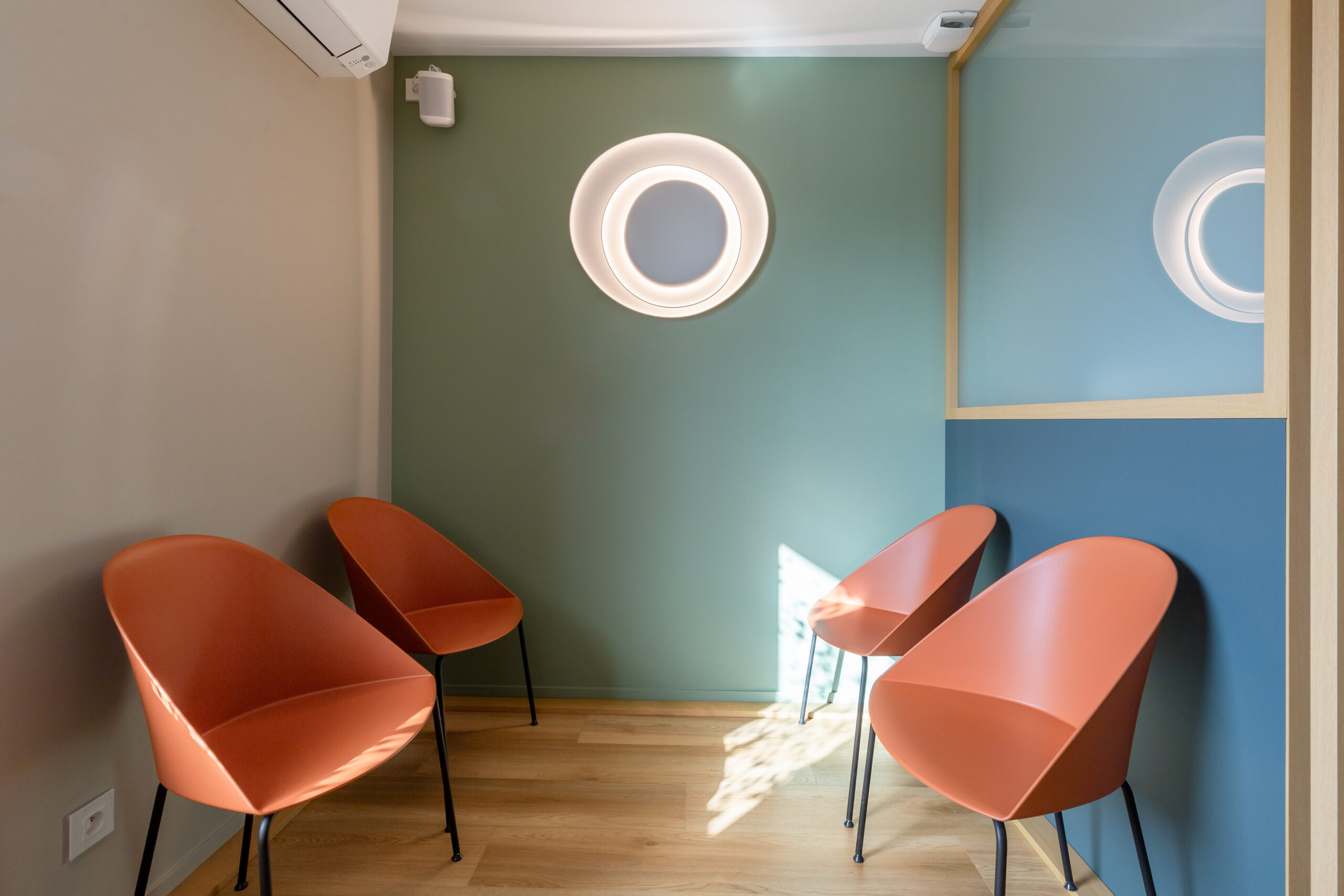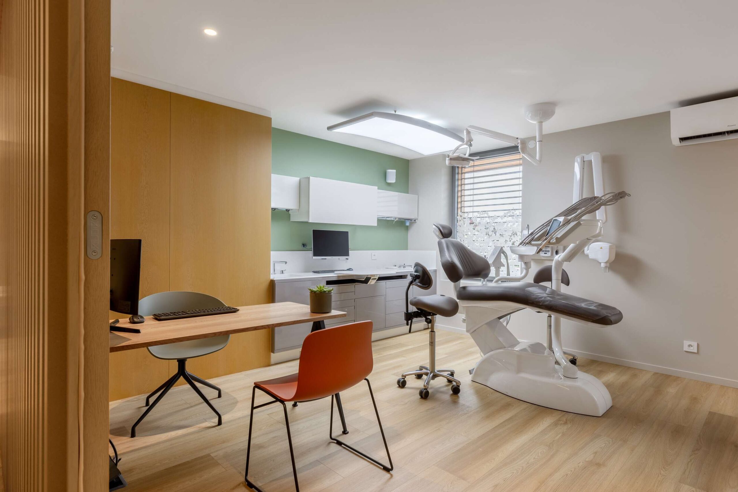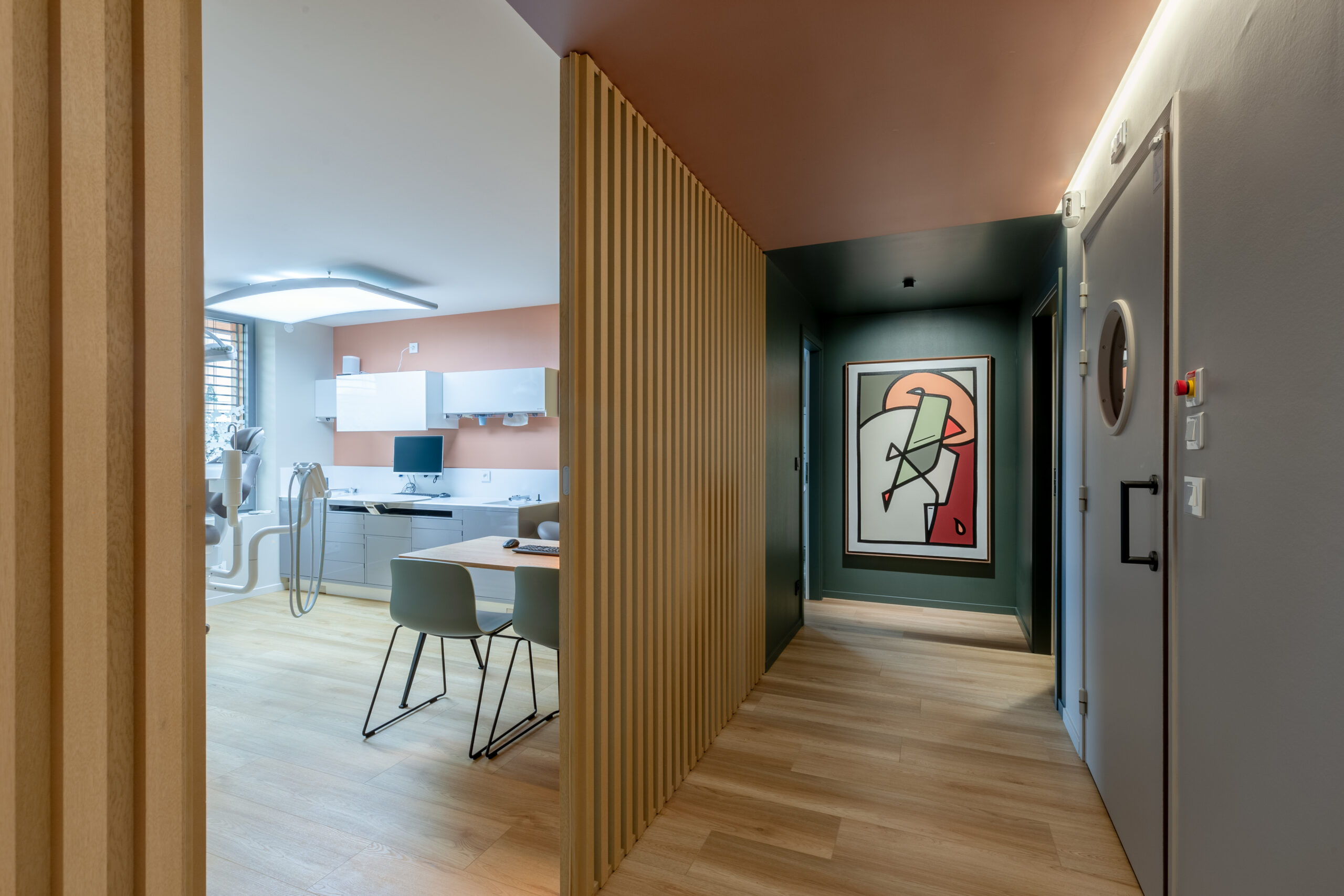 Dans ce magnifique cabinet dentaire, Wanner agencements a imaginé des claustras en chêne avec l’intégration d’une porte, créant un cloisonnement léger et chaleureux. Cette séparation astucieuse permet de distinguer l’espace des patients du plateau technique des dentistes, tout en ajoutant une touche de style, pour que même avant de passer sur le fauteuil, l’expérience soit déjà agréable… et sans douleur !