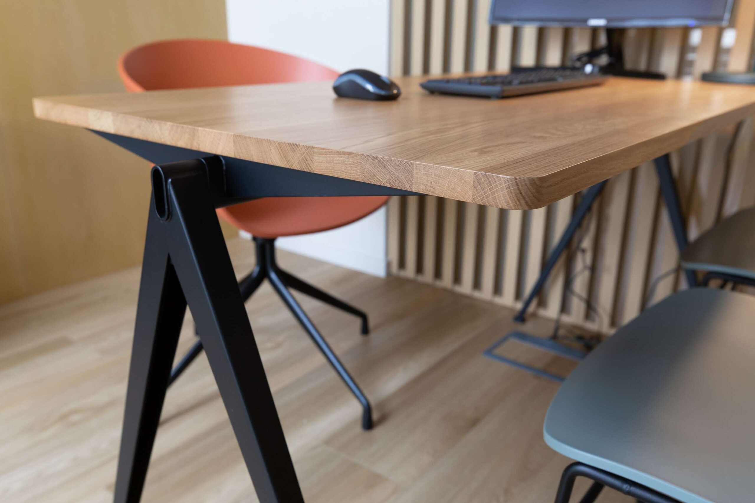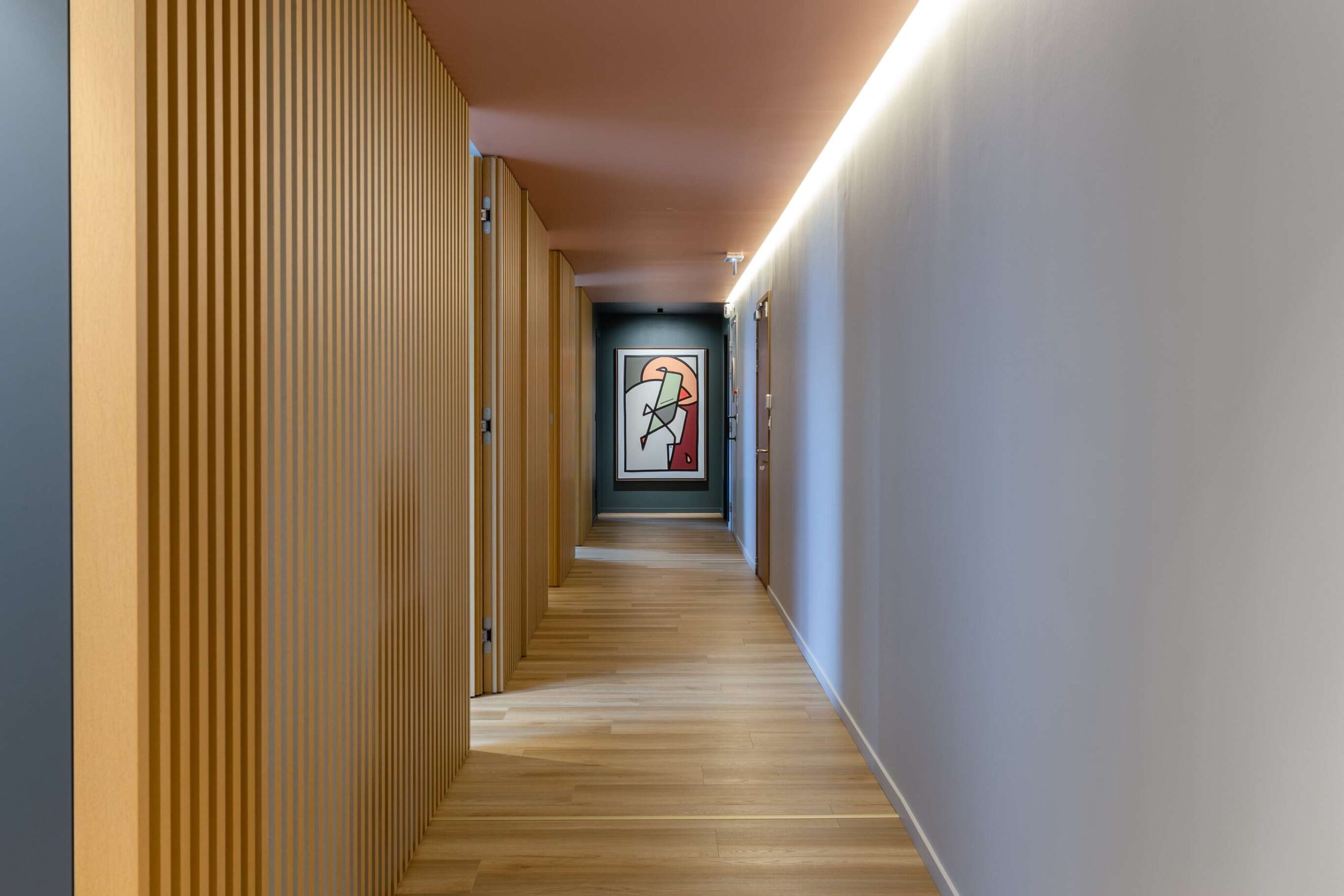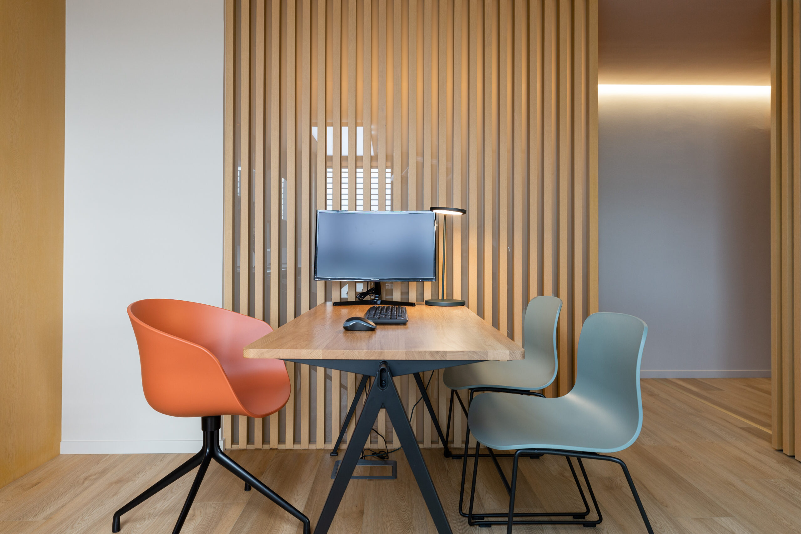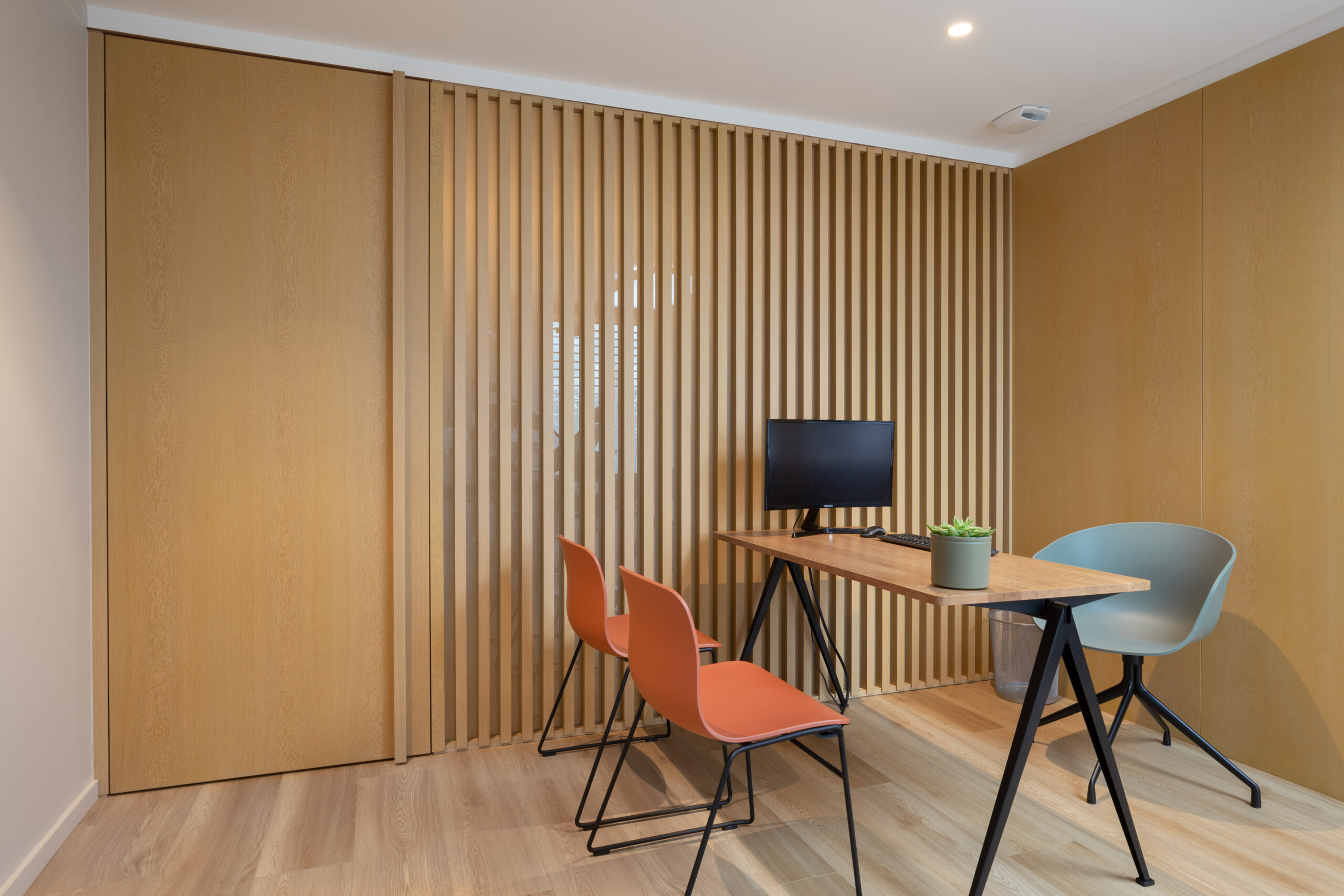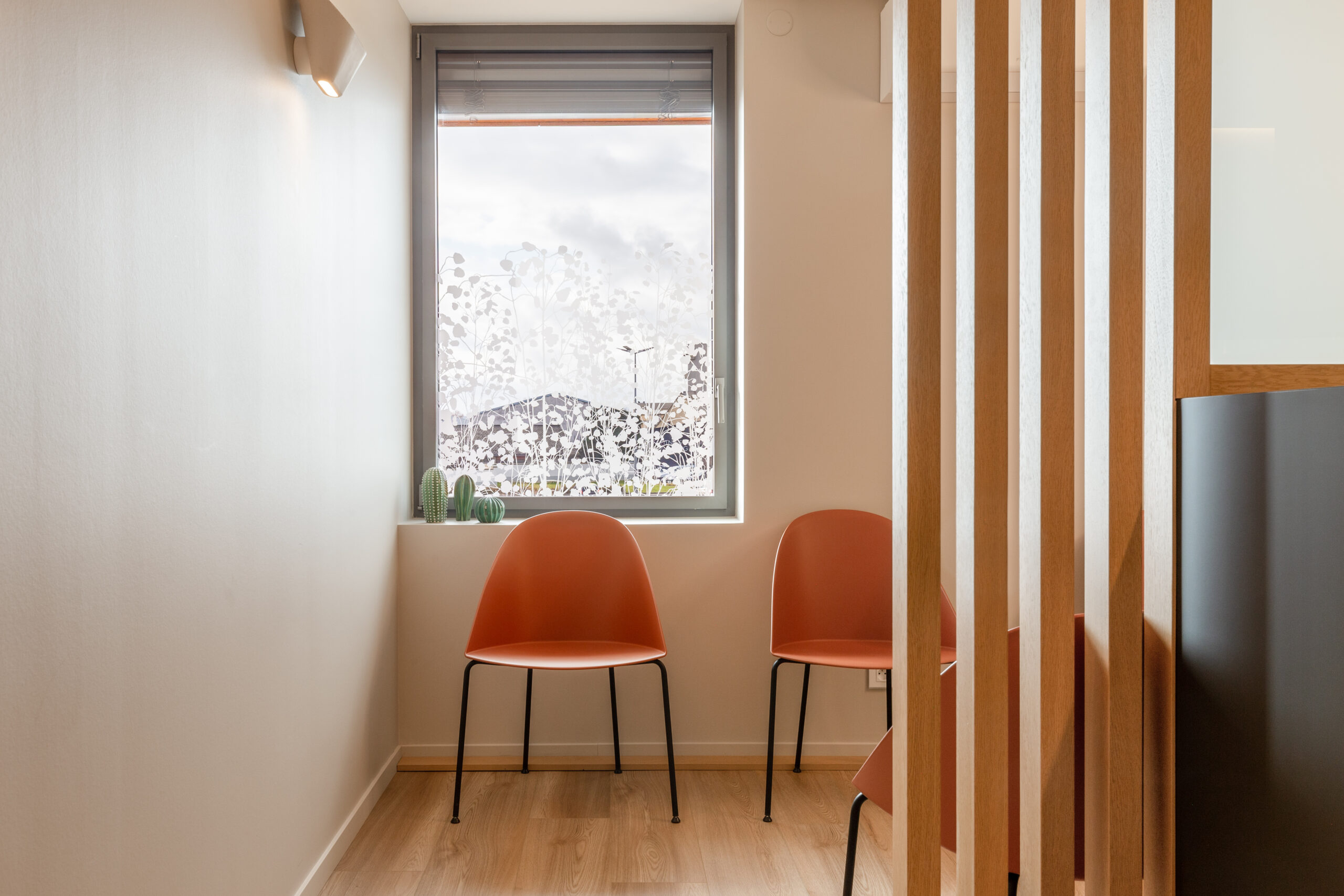 Dans ce magnifique cabinet dentaire, Wanner agencements a imaginé des claustras en chêne avec l’intégration d’une porte, créant un cloisonnement léger et chaleureux. Cette séparation astucieuse permet de distinguer l’espace des patients du plateau technique des dentistes, tout en ajoutant une touche de style, pour que même avant de passer sur le fauteuil, l’expérience soit déjà agréable… et sans douleur !