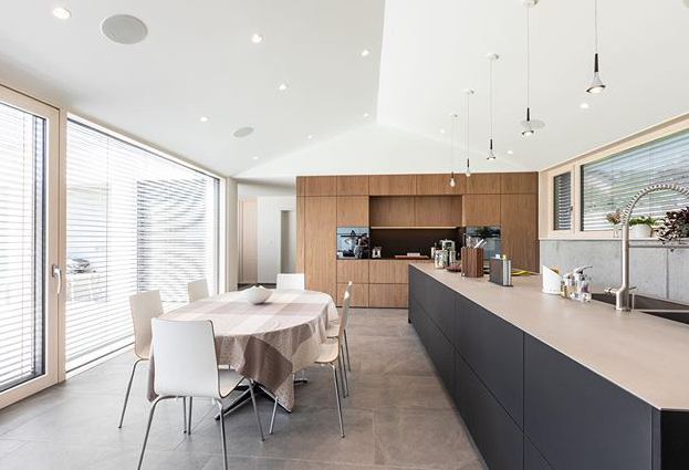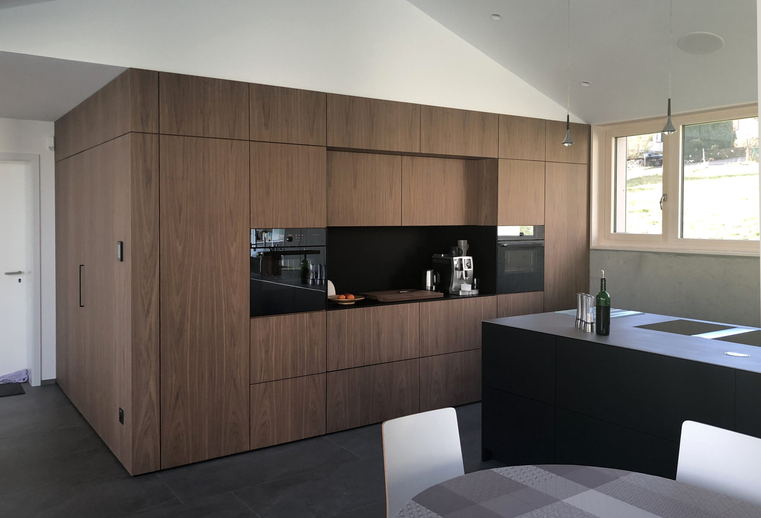 Voici une cuisine en placage Noyer US, conçue autour d’un principe de « boîte dans la boîte », abritant le cellier et la zone de cuisson avec les fours. Une niche au fond noir, dédiée à l’espace de travail, crée une sensation de panorama au sein de la cuisine. Perpendiculairement, un îlot en Fenix Nero Ingo, avec un plan de travail en inox, apporte une touche de modernité et de fonctionnalité à l’ensemble.