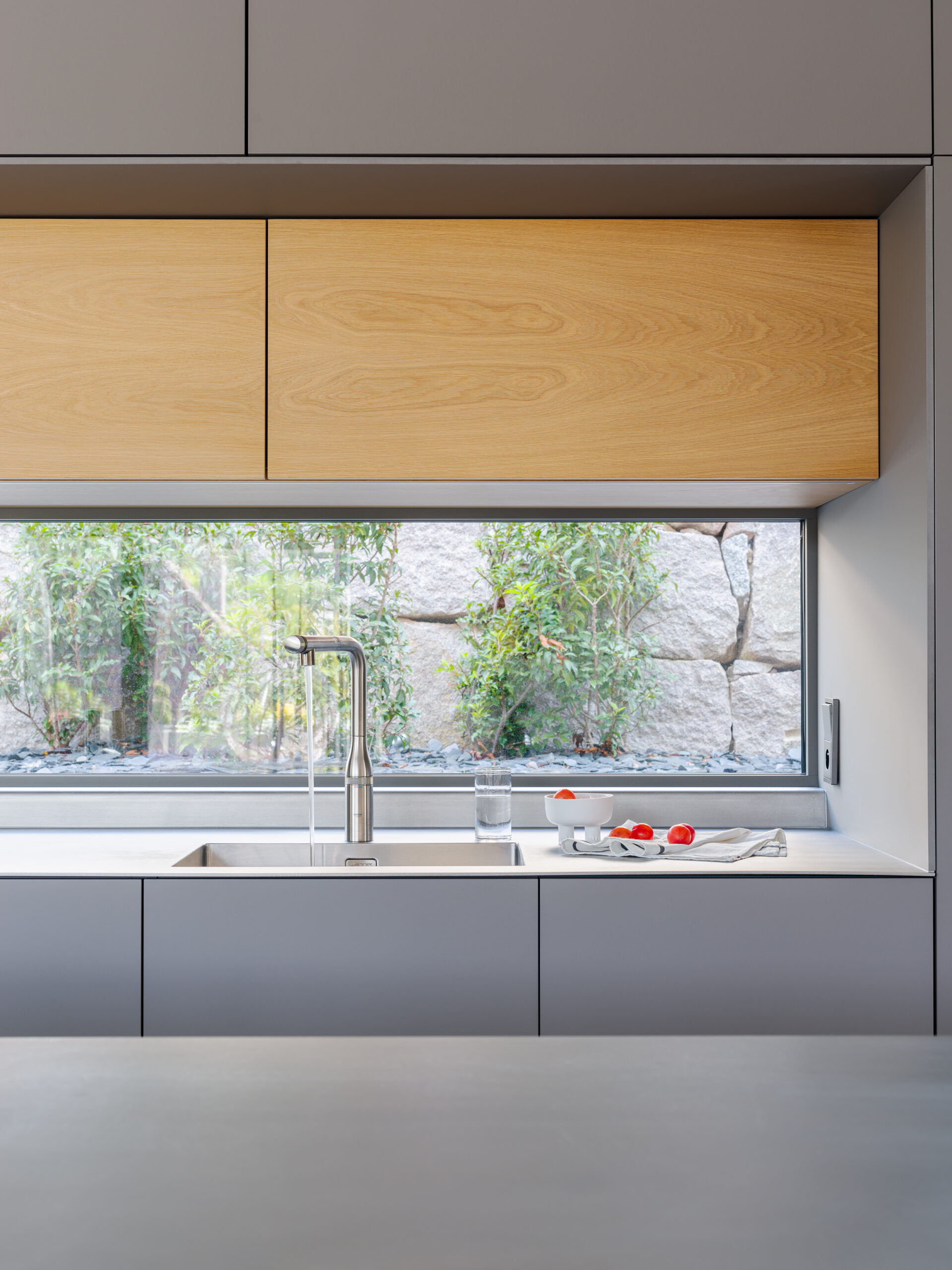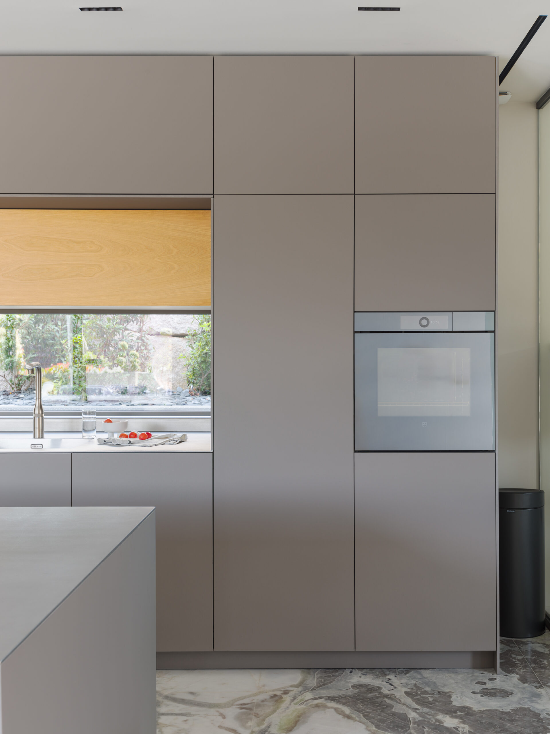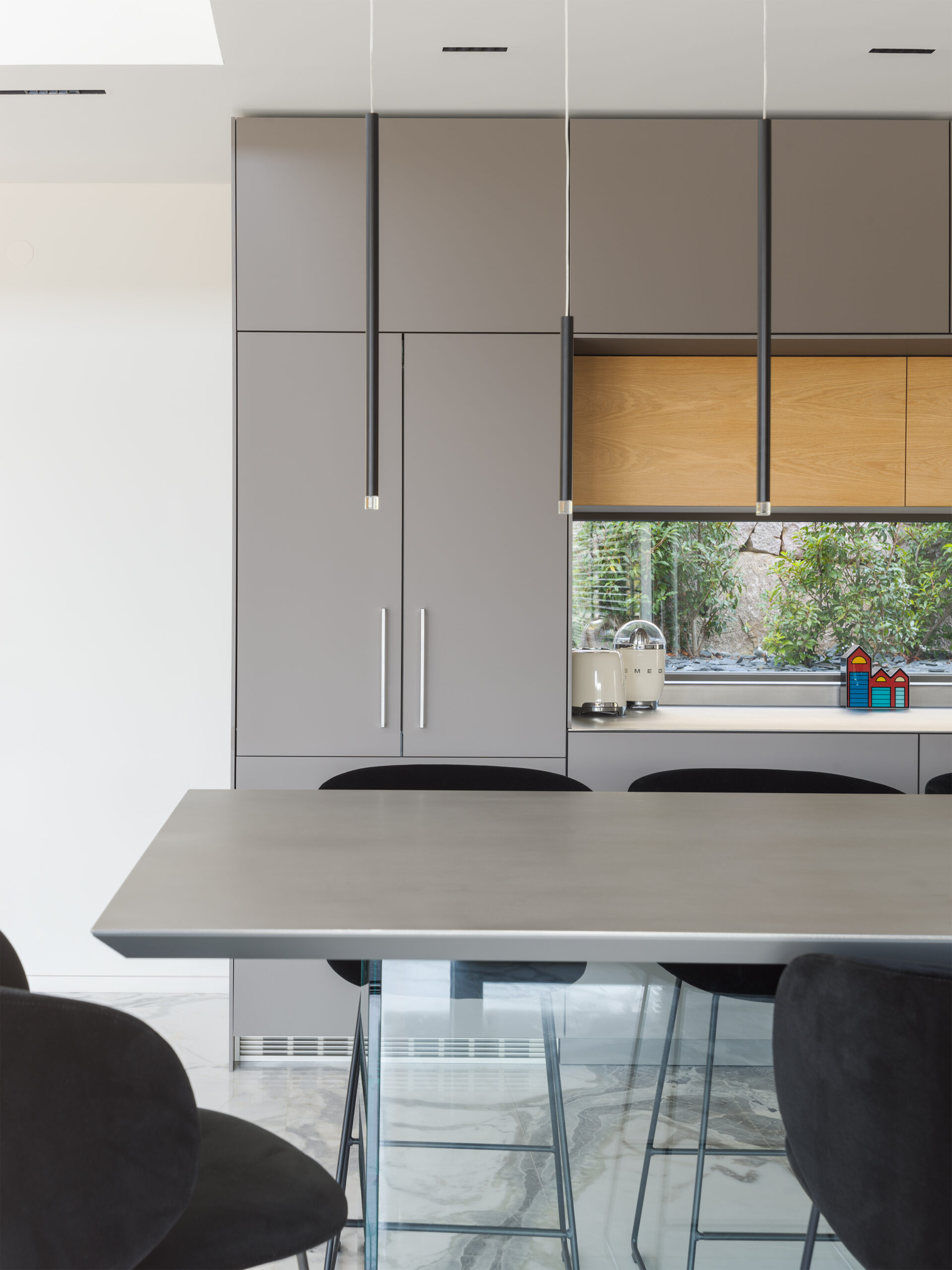 Conception et réalisation d’une cuisine élégante en Fenix Grigio Londra, avec un bandeau d’éléments hauts en placage chêne naturel encadrant la fenêtre. Le plan de travail en inox massif laminé à chaud allie robustesse et raffinement. Pour une harmonie parfaite avec la transparence de la fenêtre, le piètement du coin repas est conçu en verre, apportant légèreté et modernité à l’ensemble.