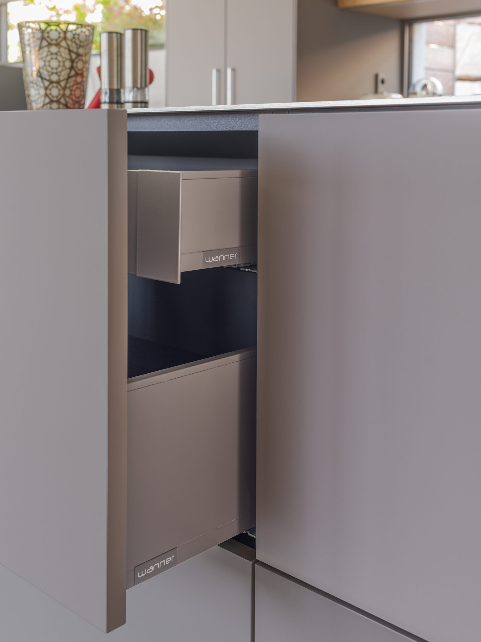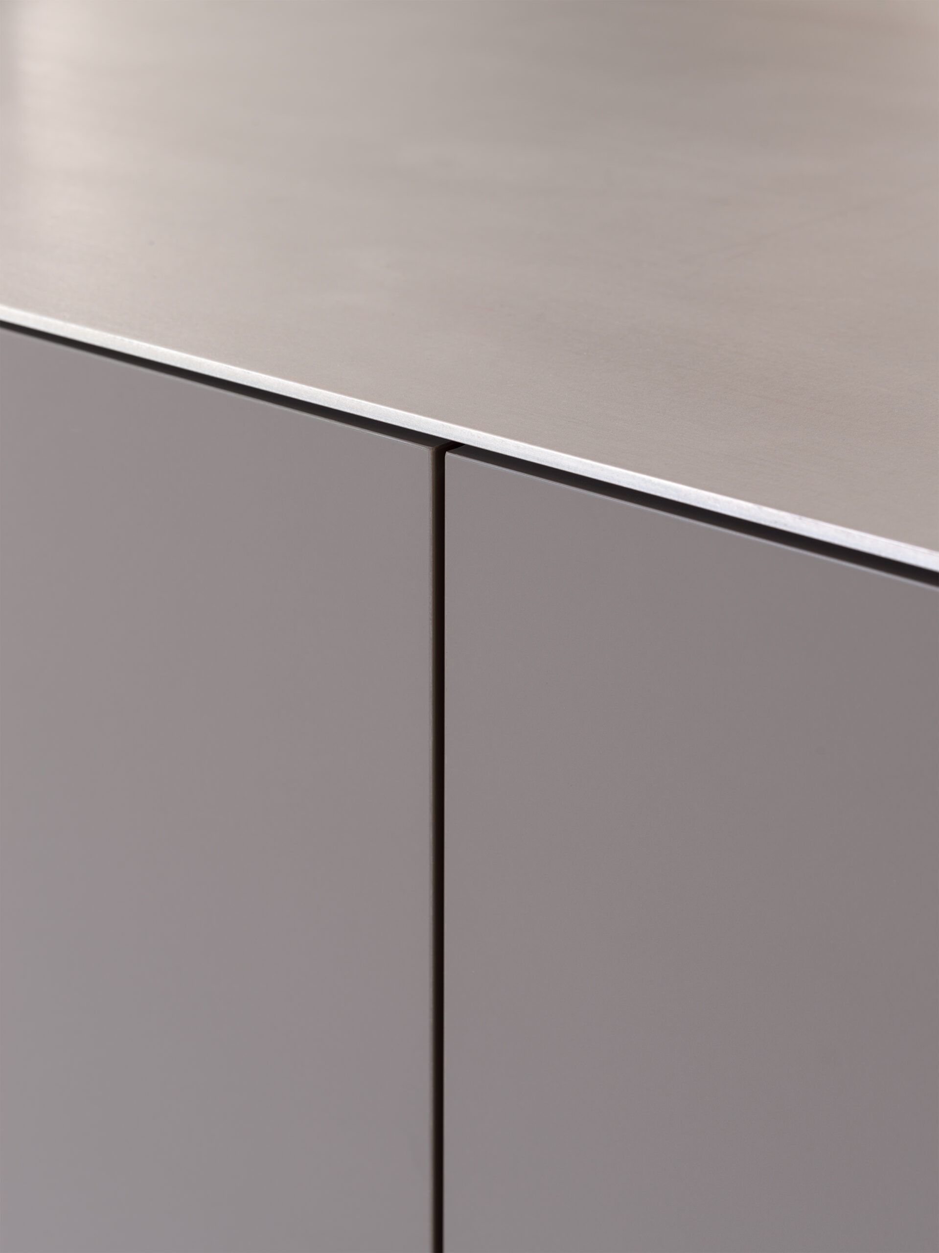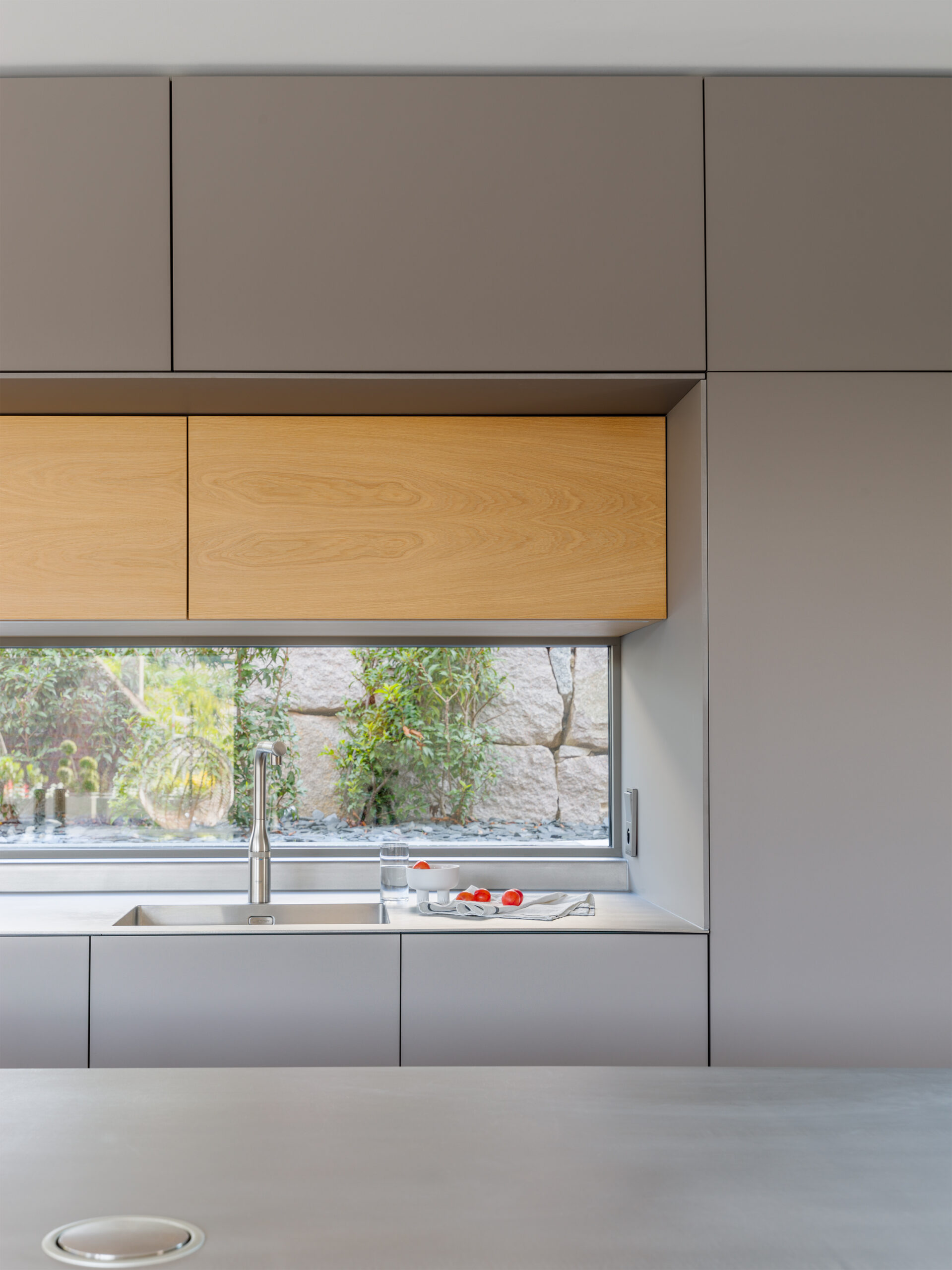 Conception et réalisation d’une cuisine élégante en Fenix Grigio Londra, avec un bandeau d’éléments hauts en placage chêne naturel encadrant la fenêtre. Le plan de travail en inox massif laminé à chaud allie robustesse et raffinement. Pour une harmonie parfaite avec la transparence de la fenêtre, le piètement du coin repas est conçu en verre, apportant légèreté et modernité à l’ensemble.