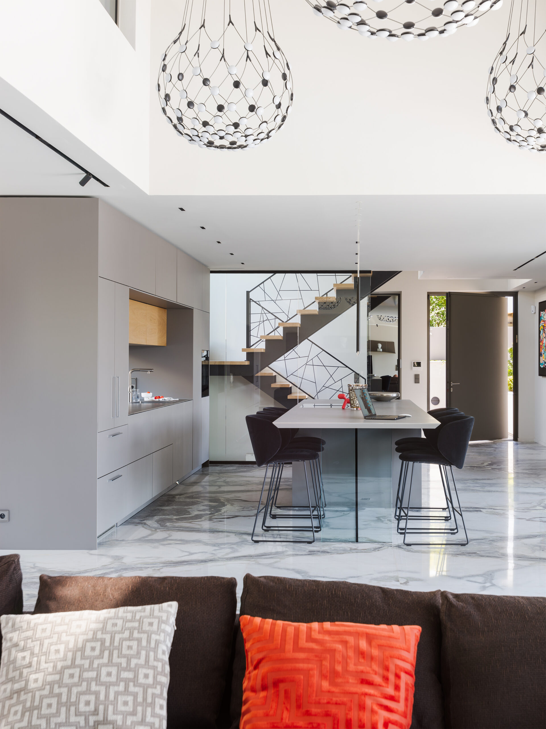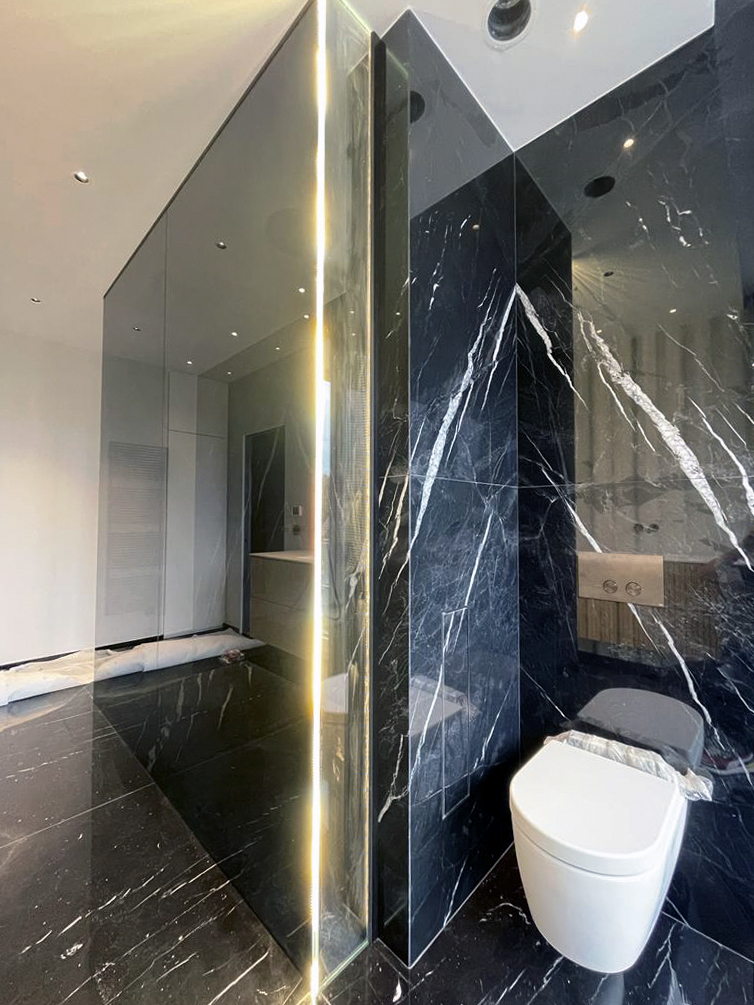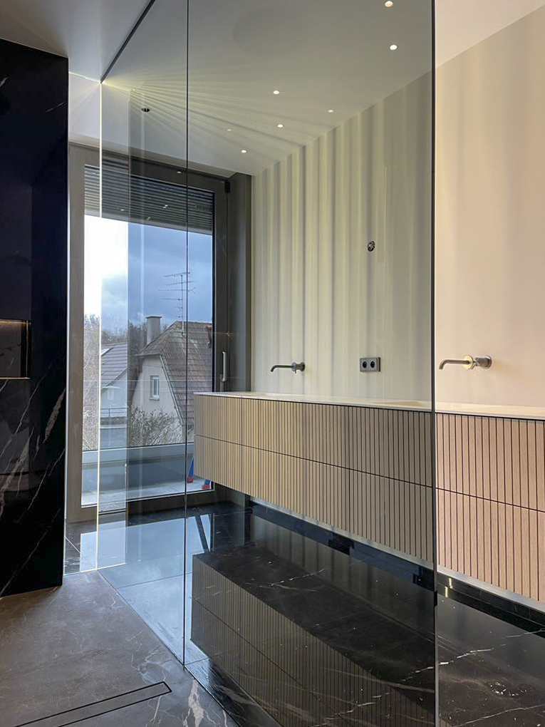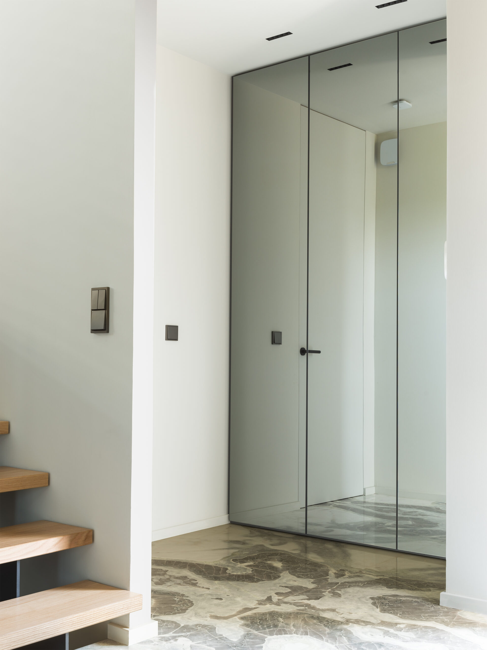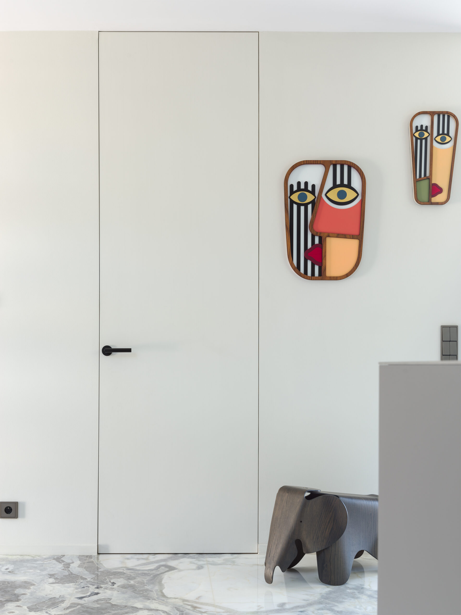 Conception et réalisation de portes affleurantes au mur, créant une sensation de hauteur et d’espace amplifiée.