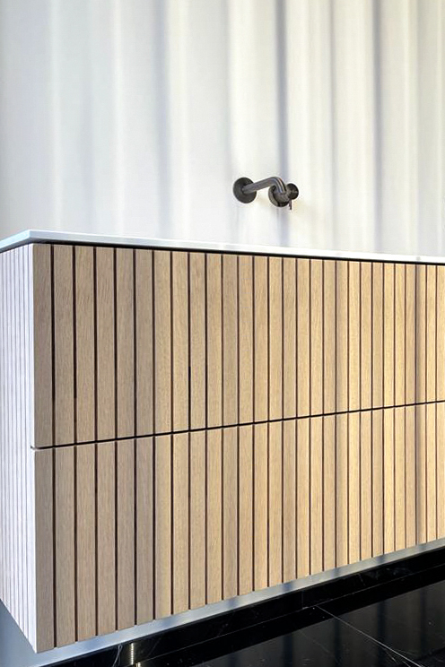Réalisation d’une salle de bain contemporaine avec des façades en chêne massif ajourées. Le contraste entre la céramique murale et le bois génère une atmosphère raffinée et chaleureuse, offrant une sensation de confort et d’élégance.