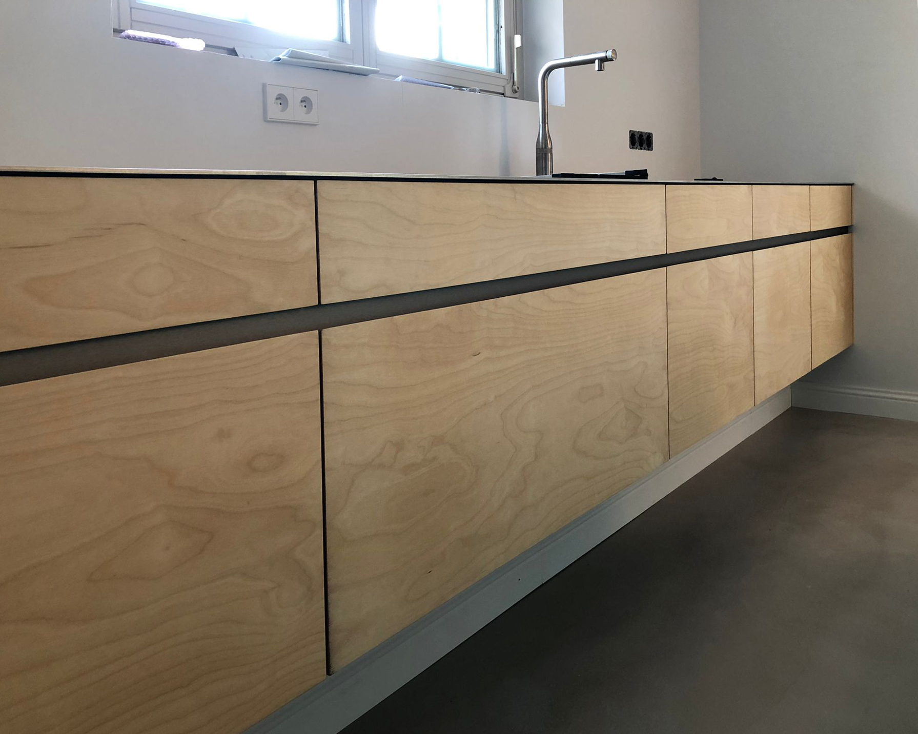 Maison He : conception d’une cuisine sur mesure en Fenix coloris Verde Kitami, avec des éléments suspendus en tripli s’étendant de mur à mur. L’aménagement intègre un coin lavage et un espace de préparation, sublimé par un plan de travail en inox laminé à chaud, alliant esthétisme et fonctionnalité.